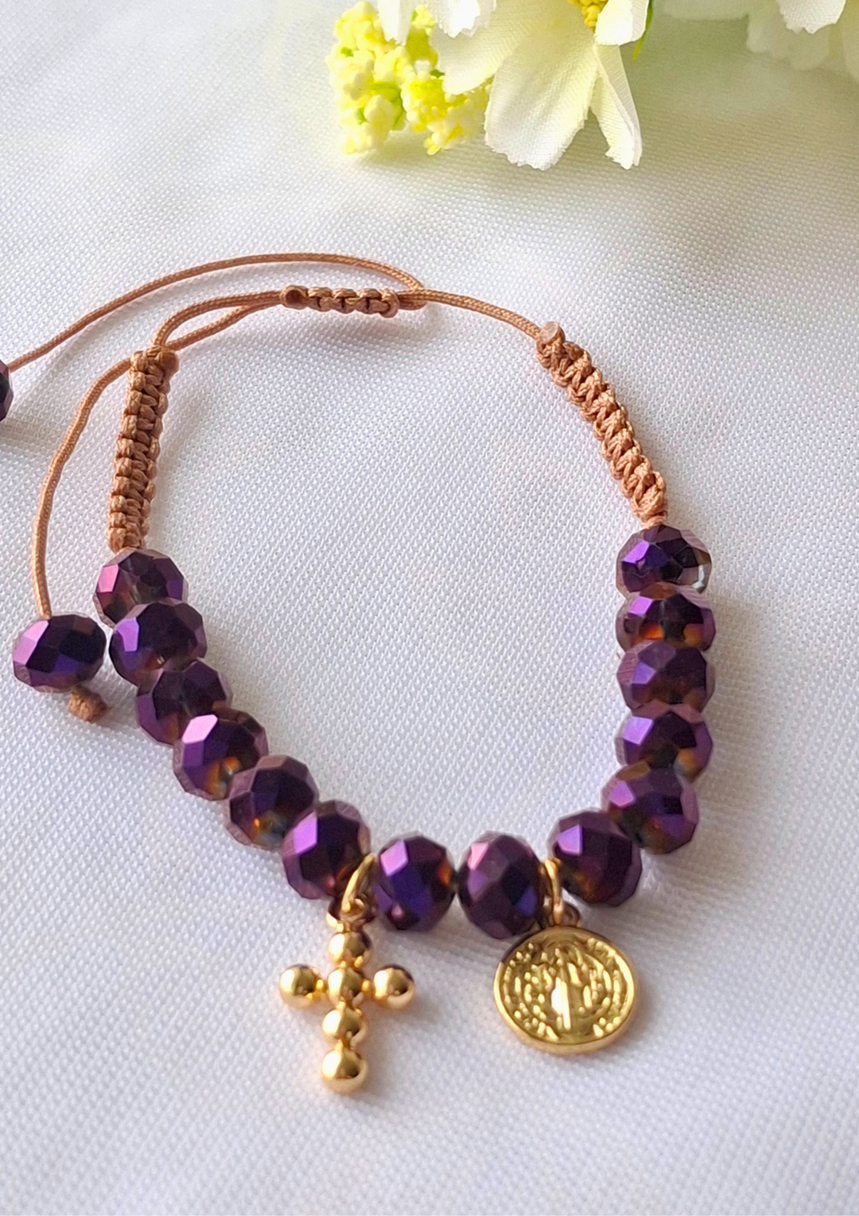 Un dúo de elegancia y espiritualidad, elaborado en cristales facetados que reflejan la luz con un brillo especial. Cada pulsera cuenta con un dije dorado de cruz y una medalla de San Benito, símbolos de devoción y protección. El diseño en hilo ajustable asegura comodidad y adaptabilidad, convirtiéndolas en un accesorio perfecto para llevar tu fe siempre contigo.