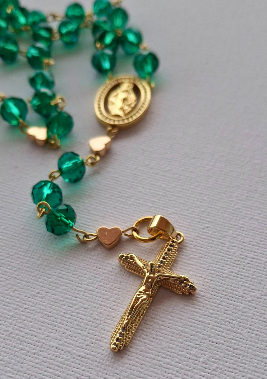 Este rosario combina cuentas de cristal de murano verde esmeralda, con delicados detalles dorados en acero inoxidable, su cruz y crucero son en rodio, garantizando belleza y durabilidad.